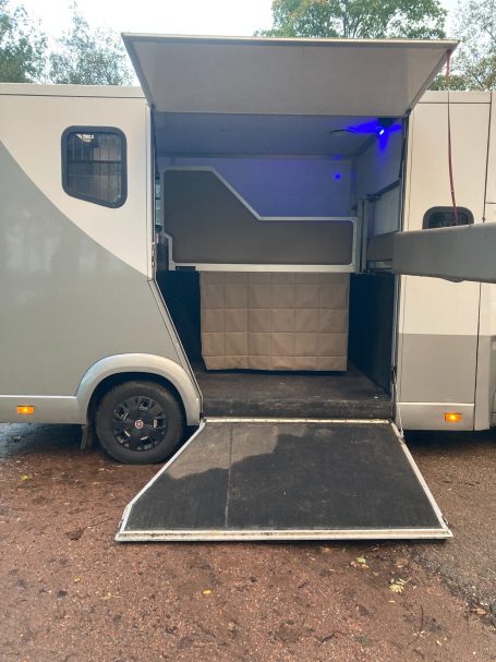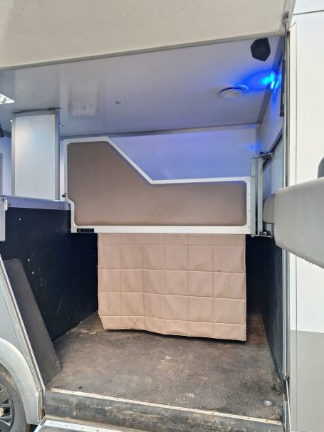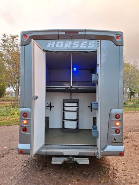 Het paardengedeelte van de wagen is ingericht voor het vervoeren van 2 paarden. Met rondom stootkussens en borstwand staan de paarden zeer comfortabel. De wagen is voorzien van 2 zijramen, 2 dakluiken en ventilatie welke te bedienen is vanuit de cabine voor frisse lucht. Daarnaast is er reguliere verlichting als ook blauwe verlichting, beide ook te bedienen vanuit de cabine. Tevens heeft de wagen een ruime zadelkamer achterin.